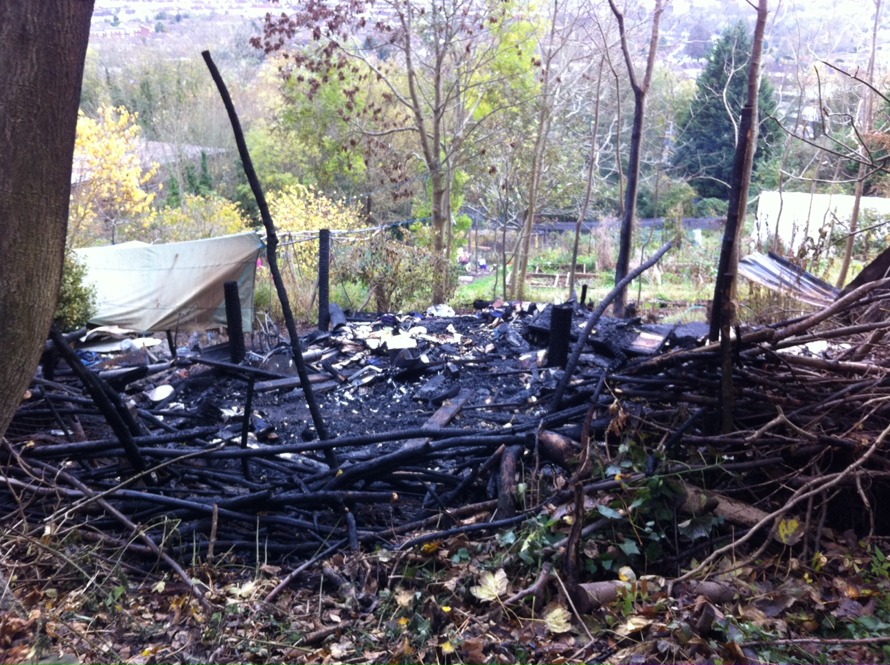On Thursday night our allotment shed was burnt to the ground. The fire was so fierce that neighbours called the fire brigade who had to stumble through woodland to put out the blaze and stop our Saxon roundhouse from also catching fire.